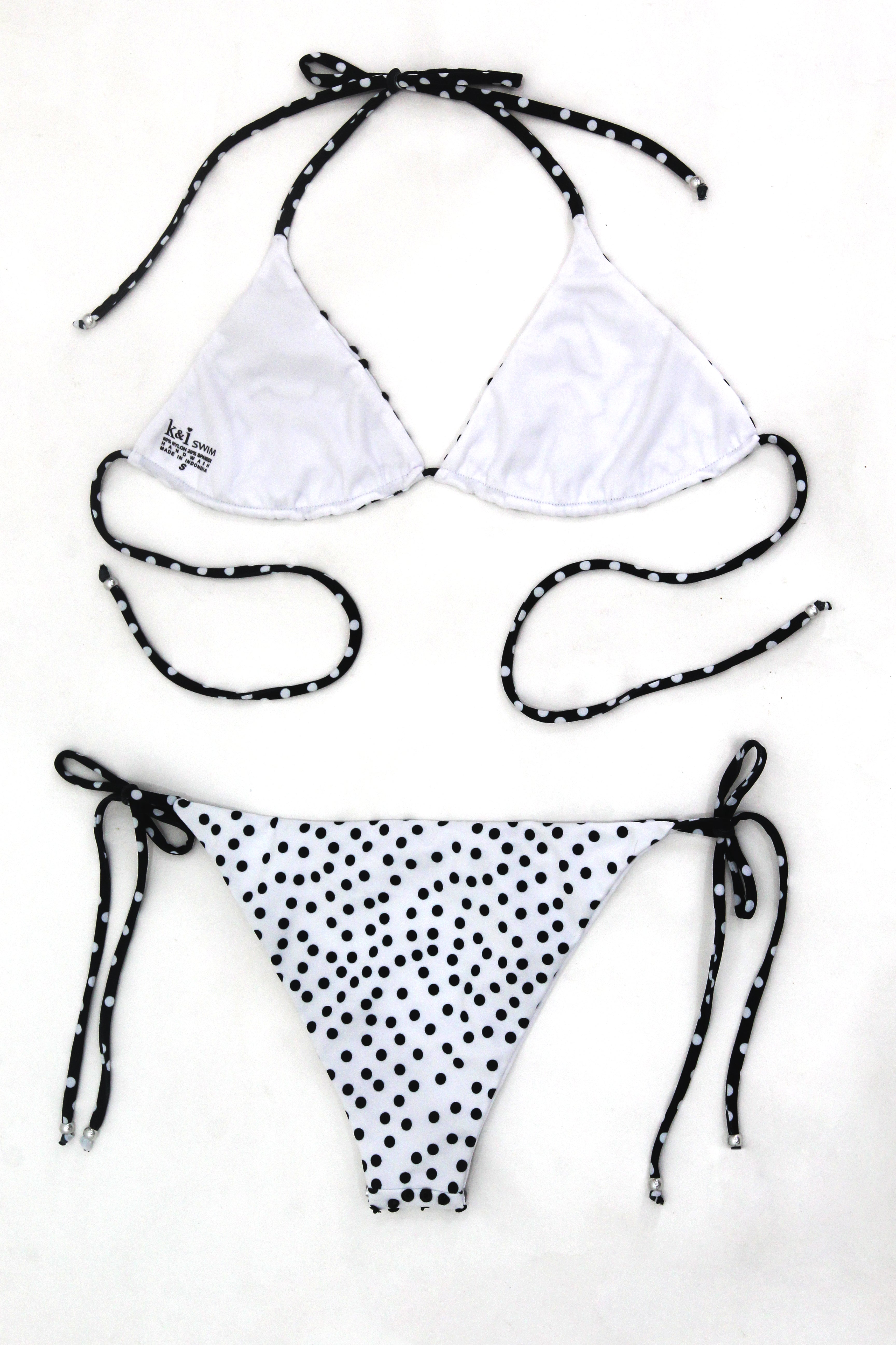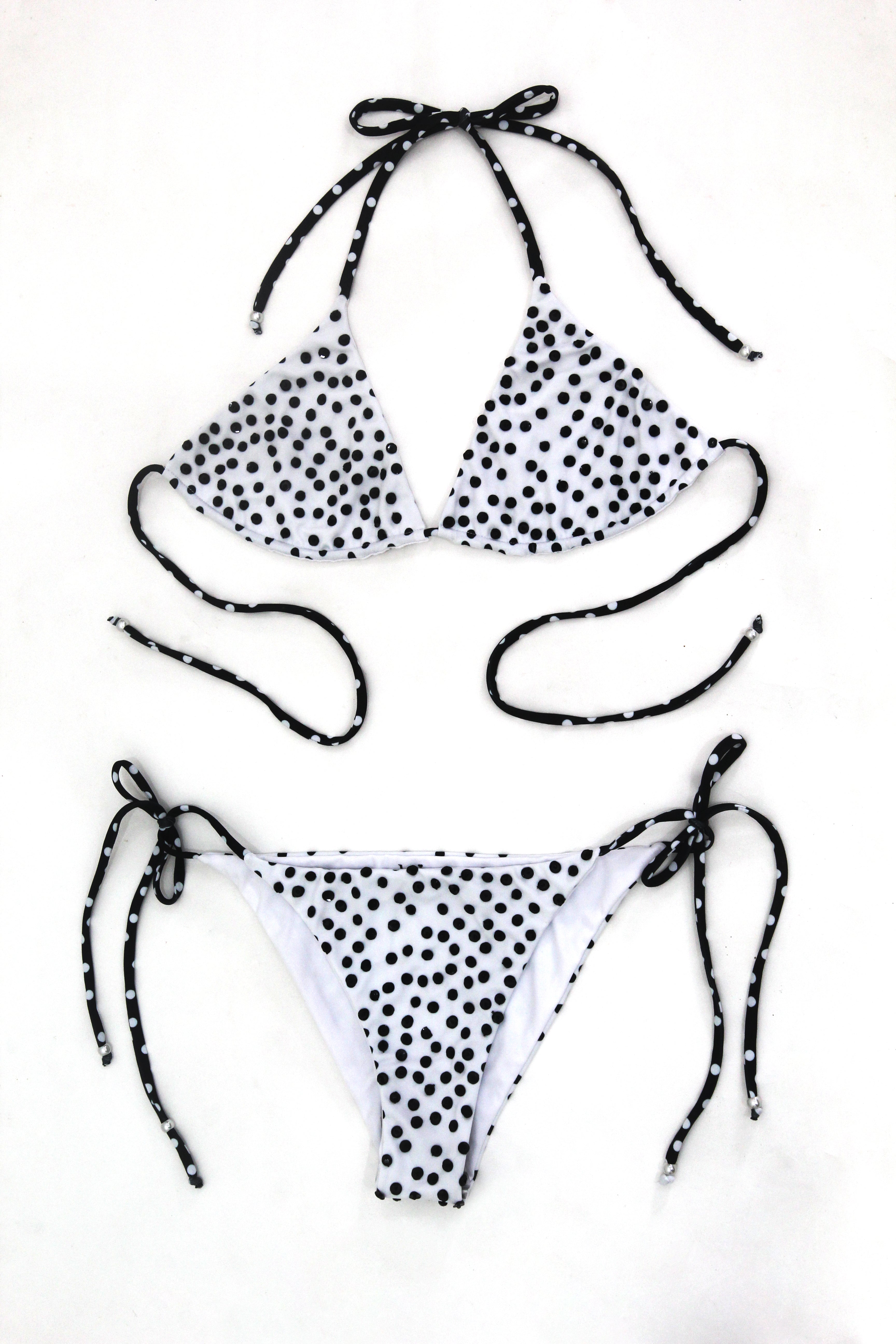 A timeless black and white polka dot bikini in a classic triangle string style. The playful print and adjustable tie details offer a fun, retro-inspired look.
