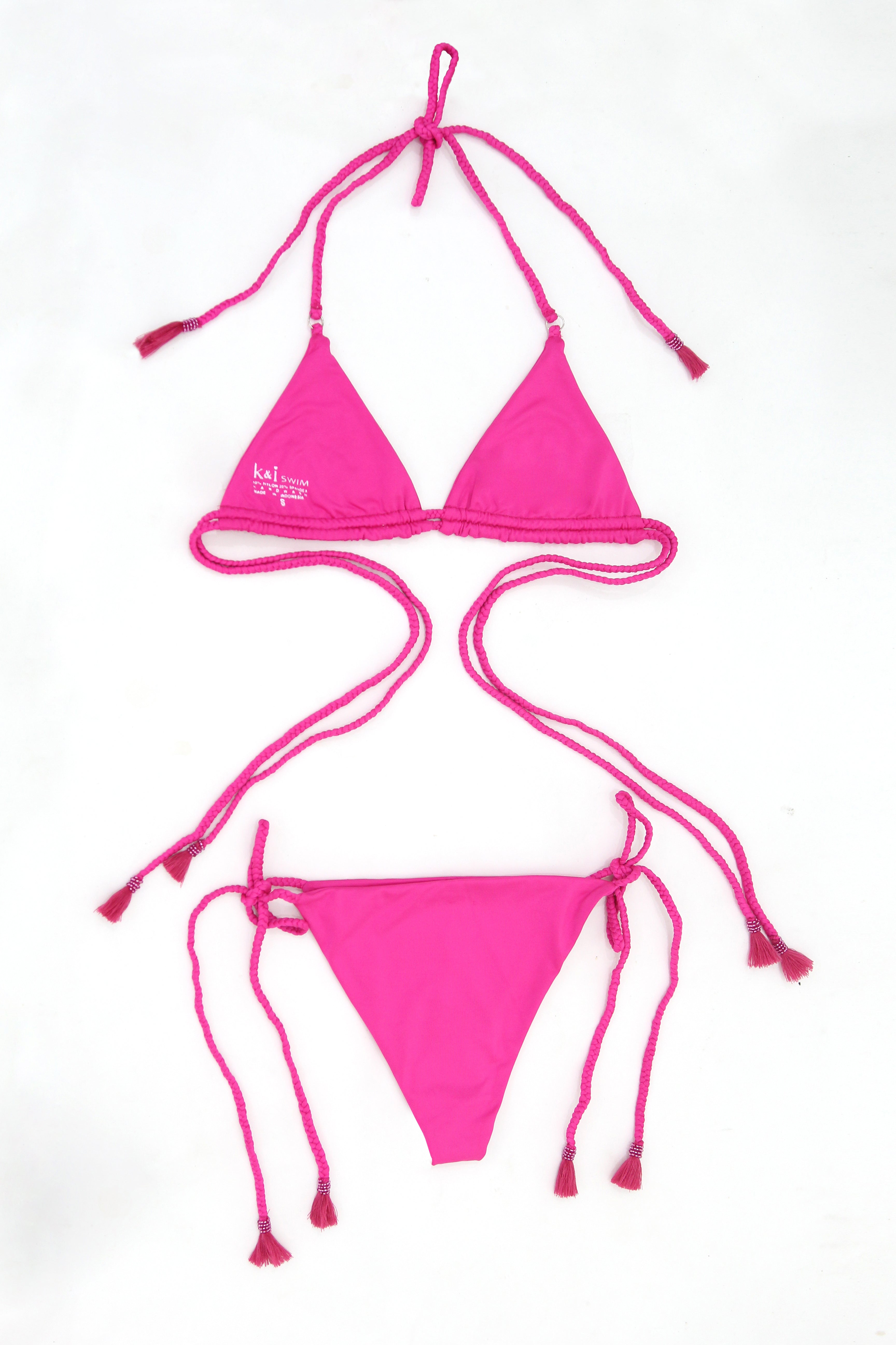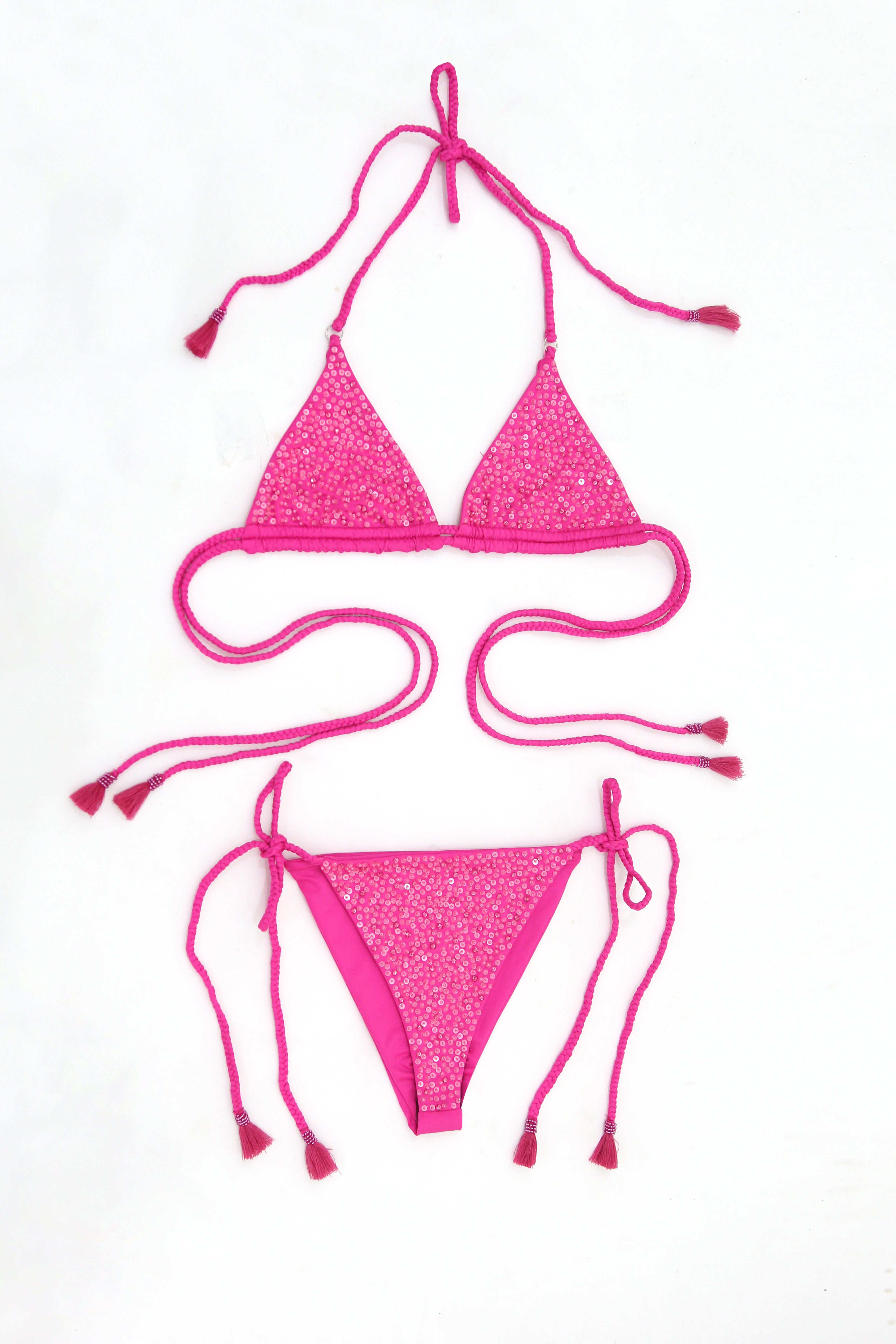A high-energy hot pink triangle bikini fully covered in micro-sequin embellishments for ultimate sparkle. The adjustable ties feature playful tassel details.
