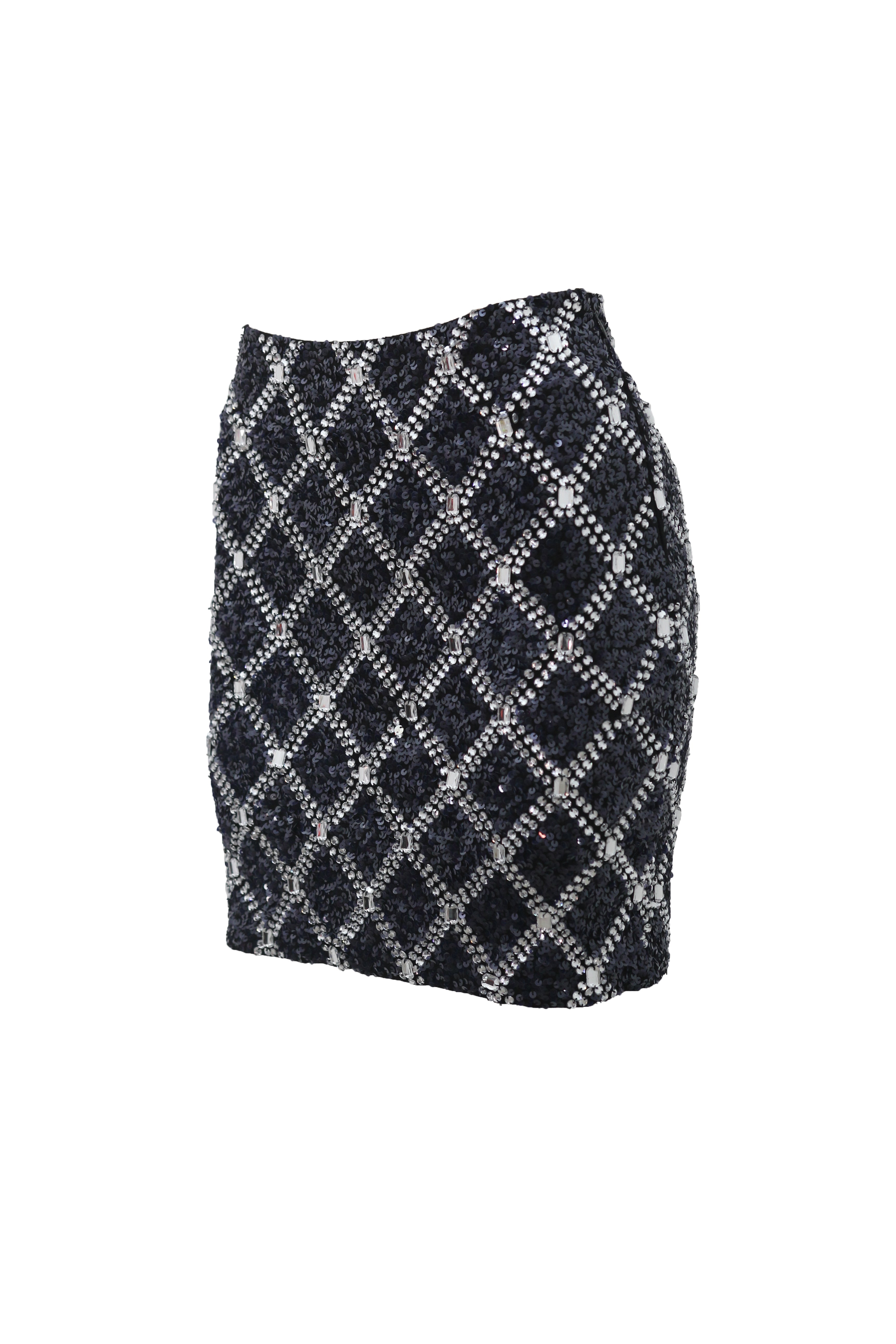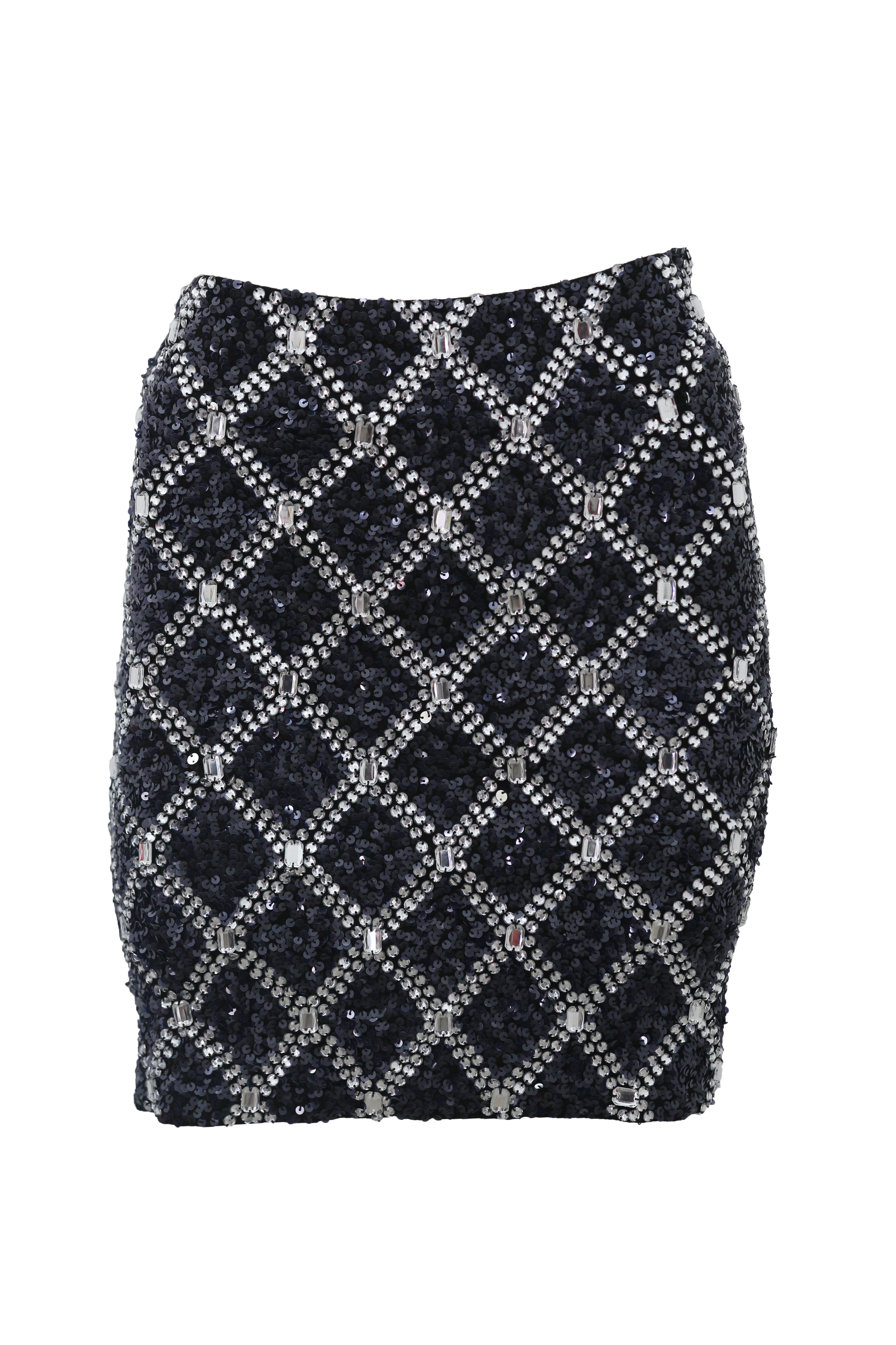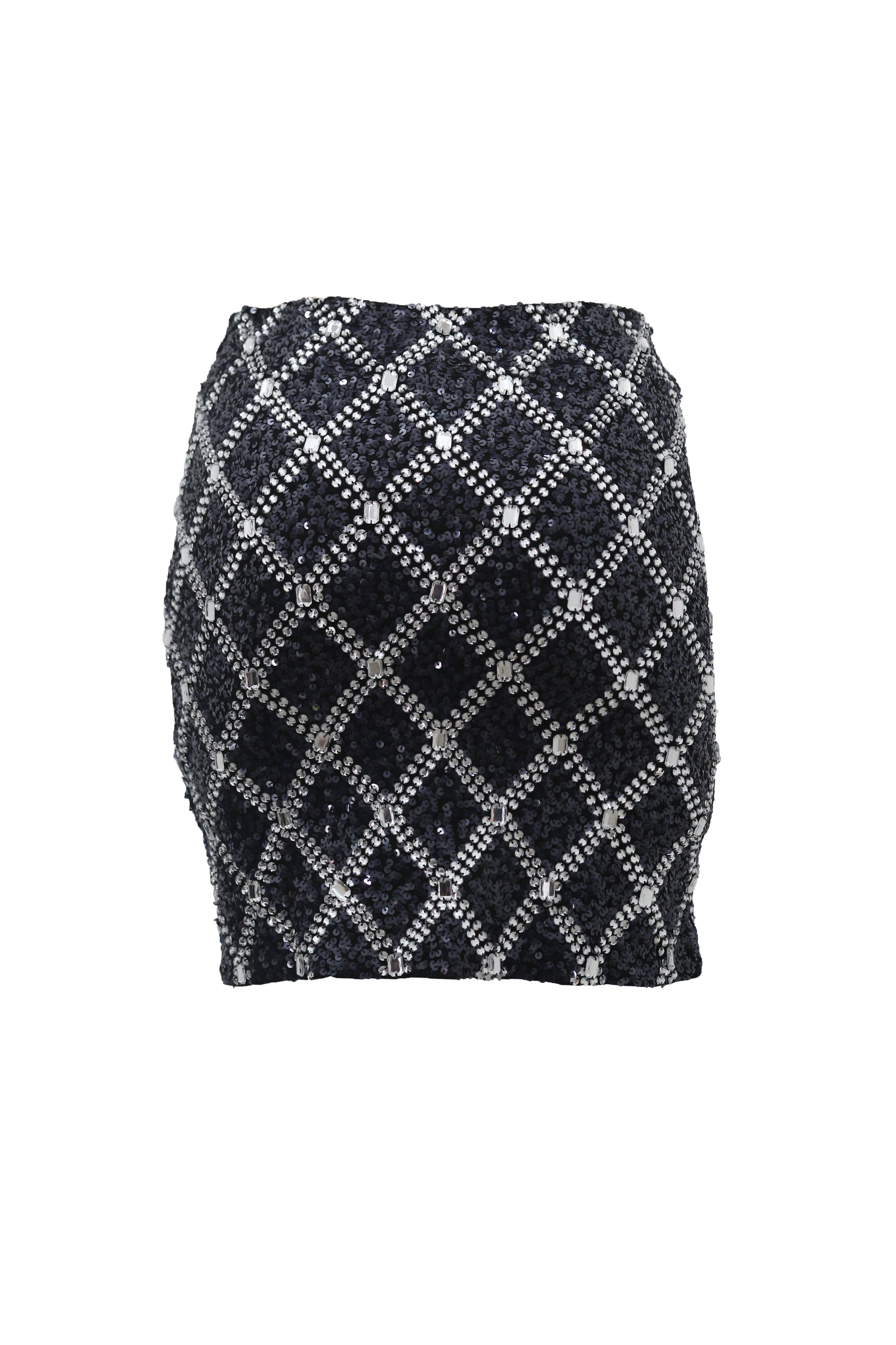 A bodycon mini skirt featuring the same eye-catching sequin diamond pattern.