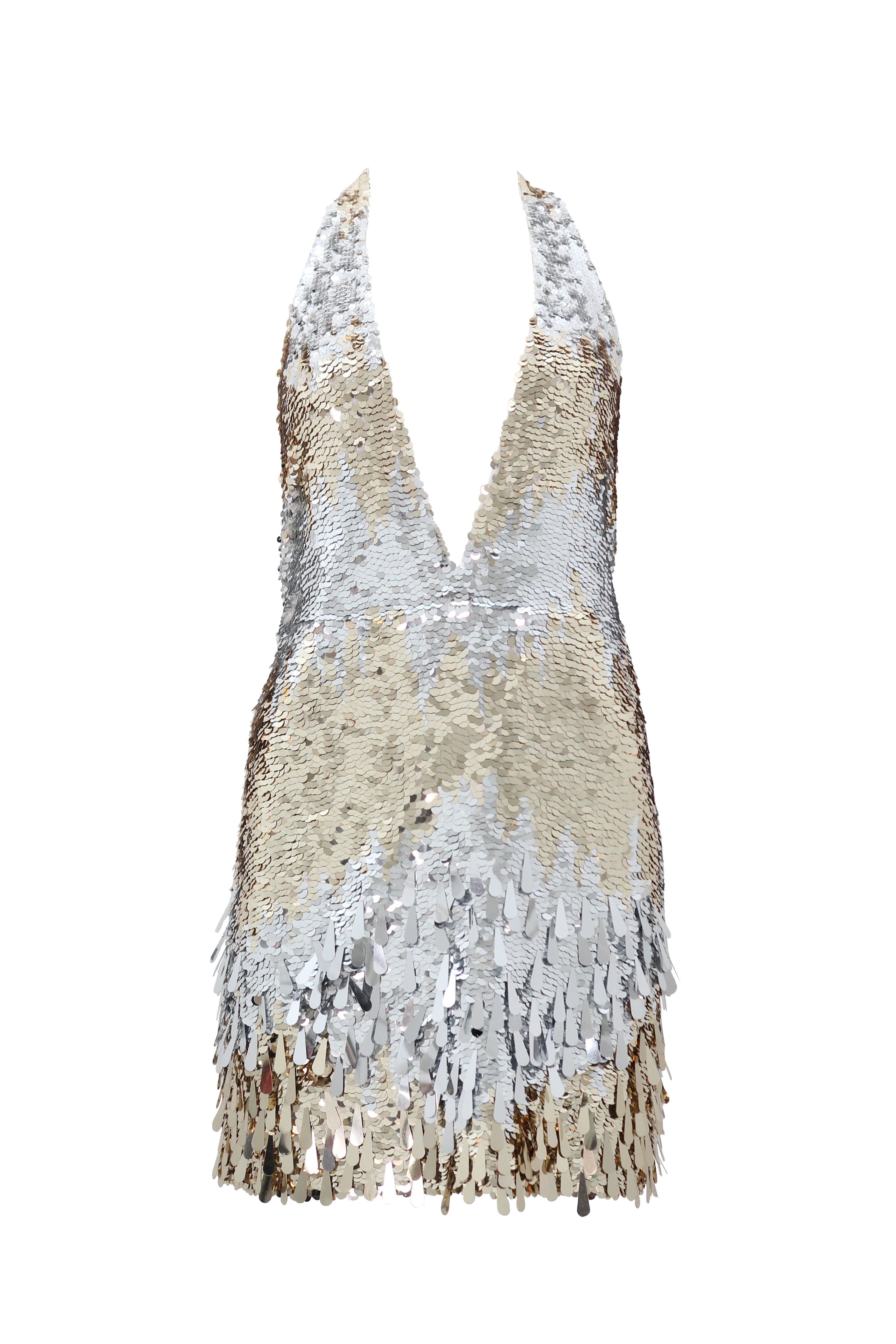 A show-stopping halter mini dress featuring a deep V-neckline. The dress is embellished with metallic silver hanging sequins that create dynamic movement and mirror-like shine.
