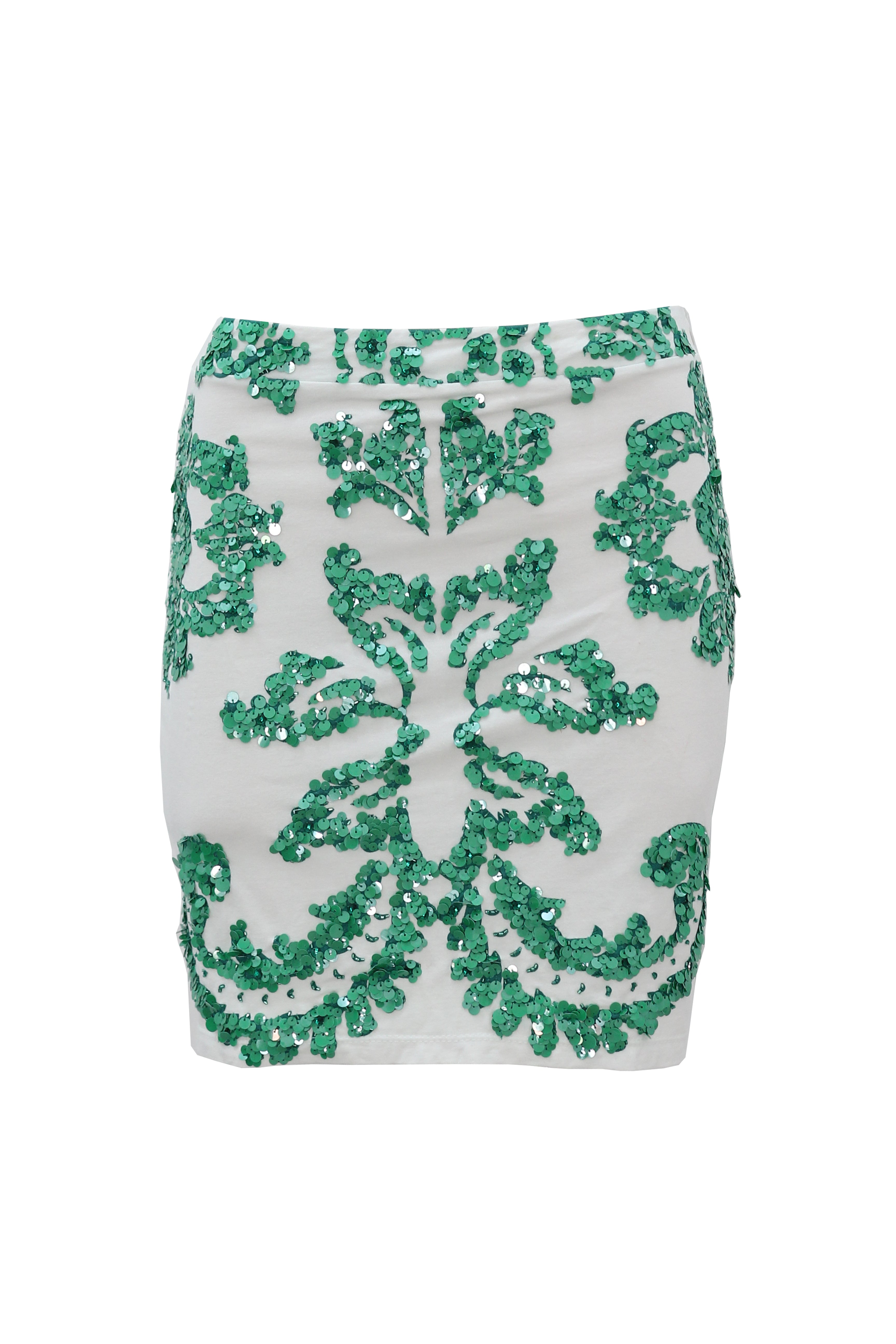 A form-fitting mini skirt with an all-over matching green sequin pattern, ideal for warm-weather daytime events.