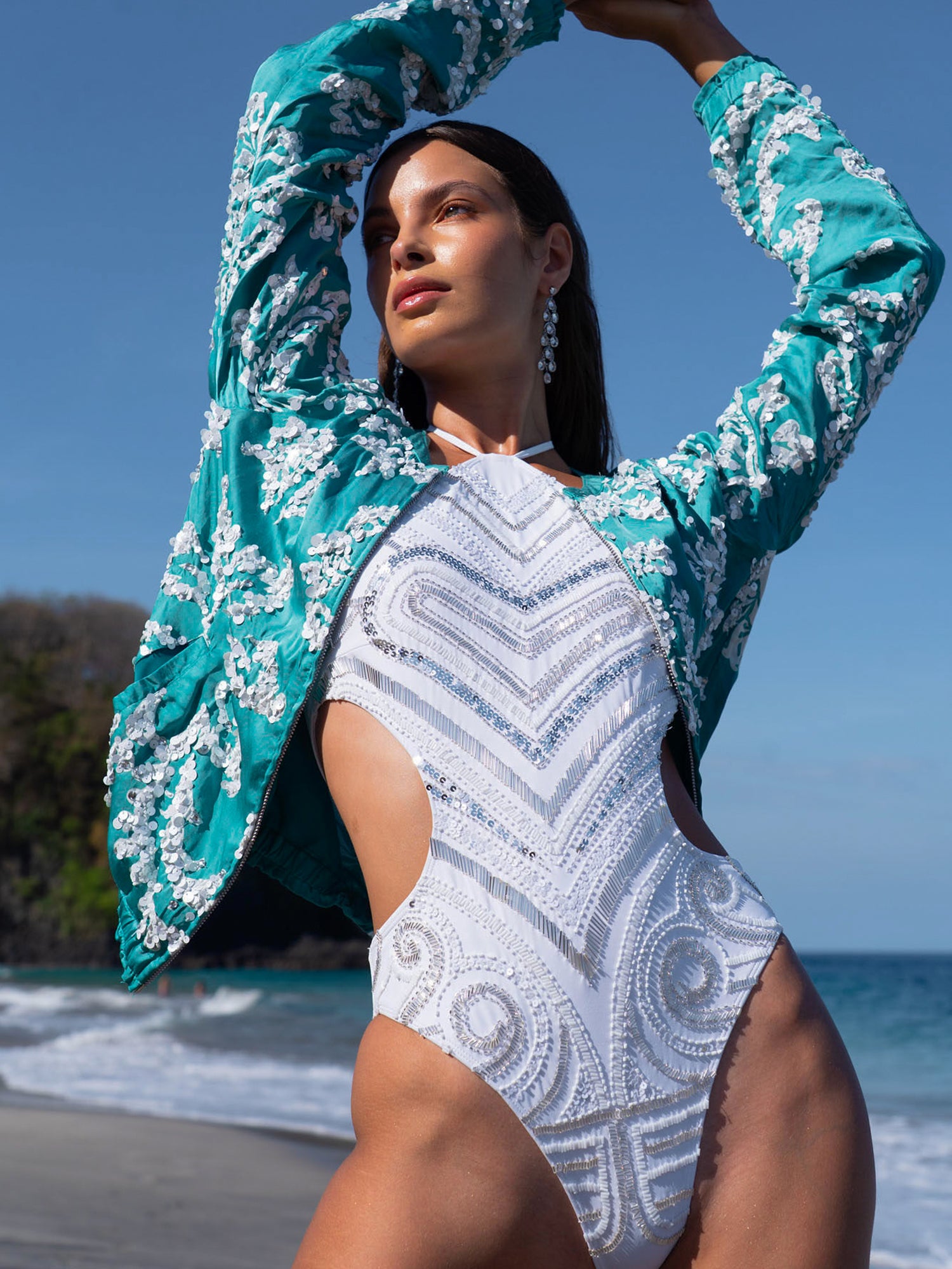 A trendy bomber jacket in teal, covered in a detailed white sequin floral/lace pattern for a glamorous cover-up.