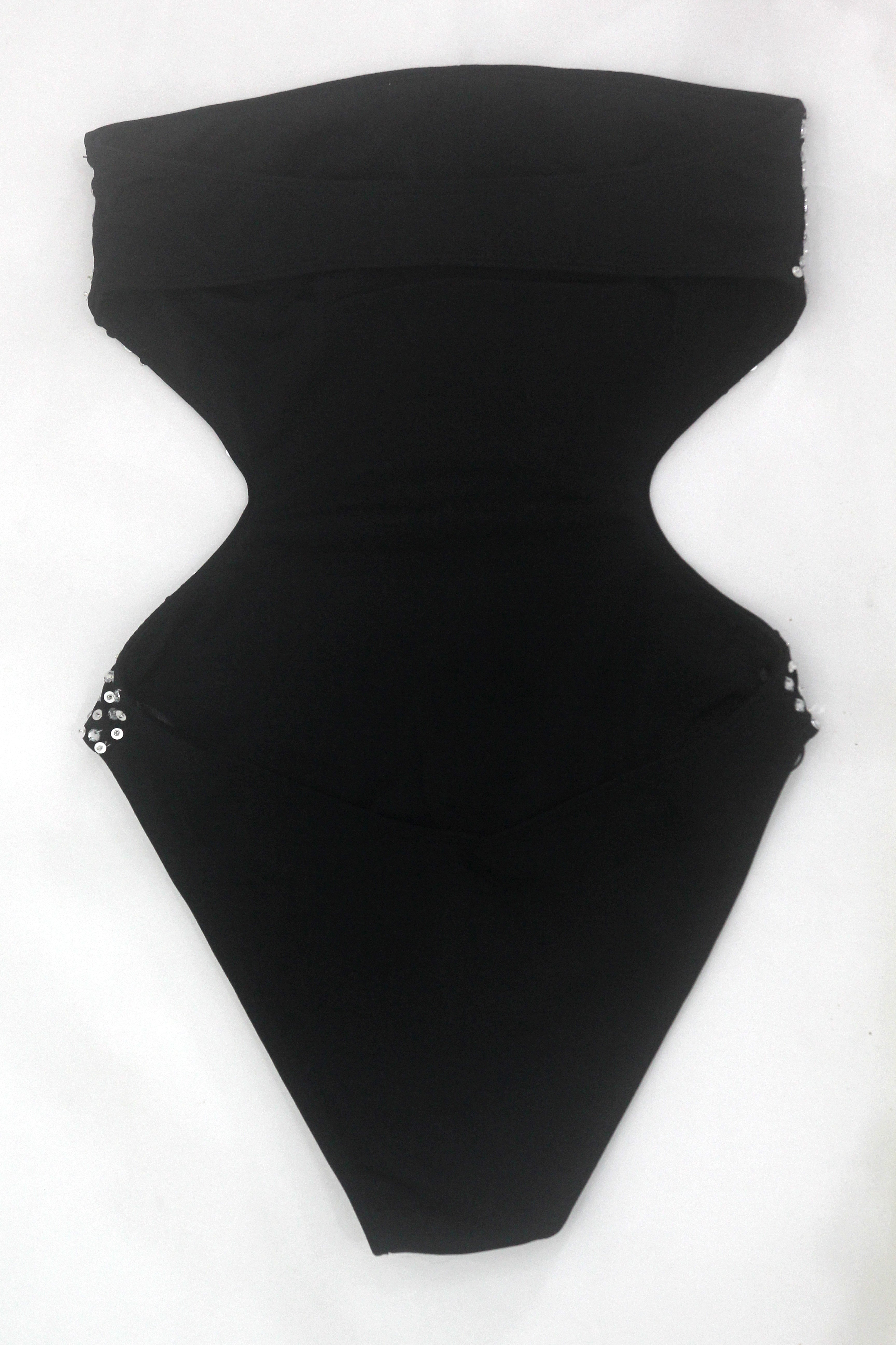 This black strapless one-piece, adorned with hand beaded crystals and sequins and seductive cutouts, is designed to steal the spotlight. Perfect for poolside glamour or a sunset soirée.