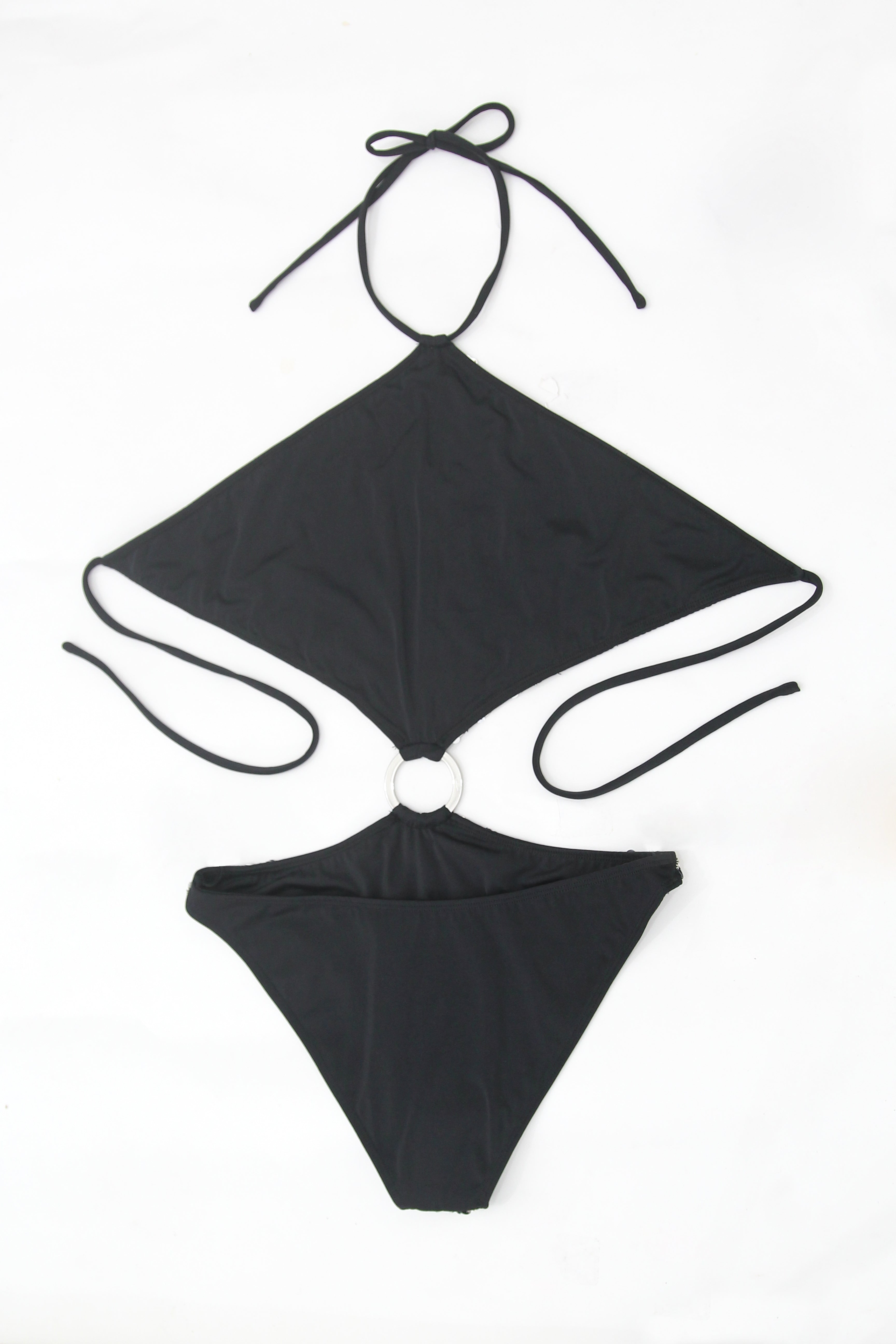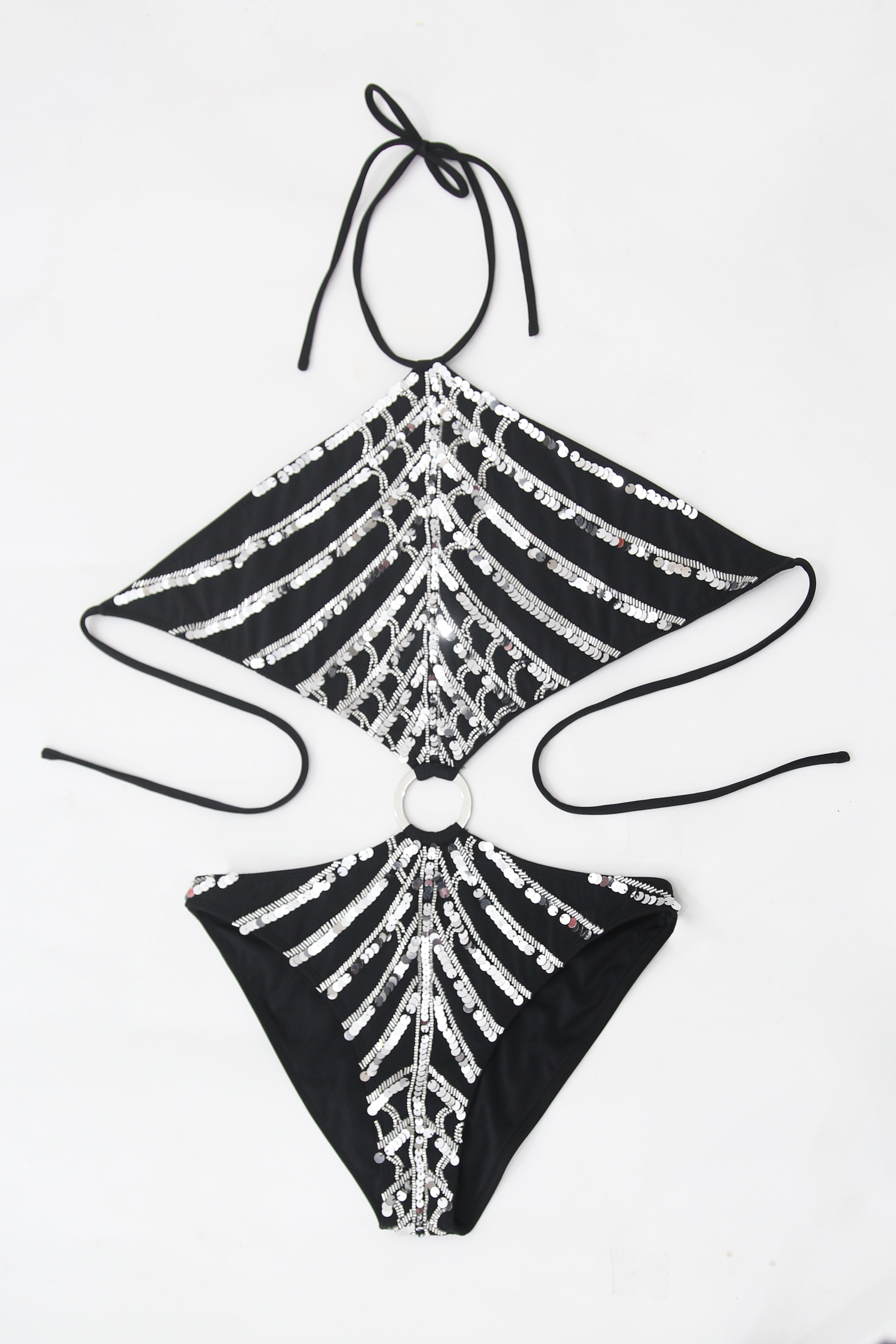 A dramatic black halter one-piece swimsuit with striking side and front cut-outs, featuring a silver O-ring detail. The suit is embellished with a bold, silver sequin palm or feather motif with beading.