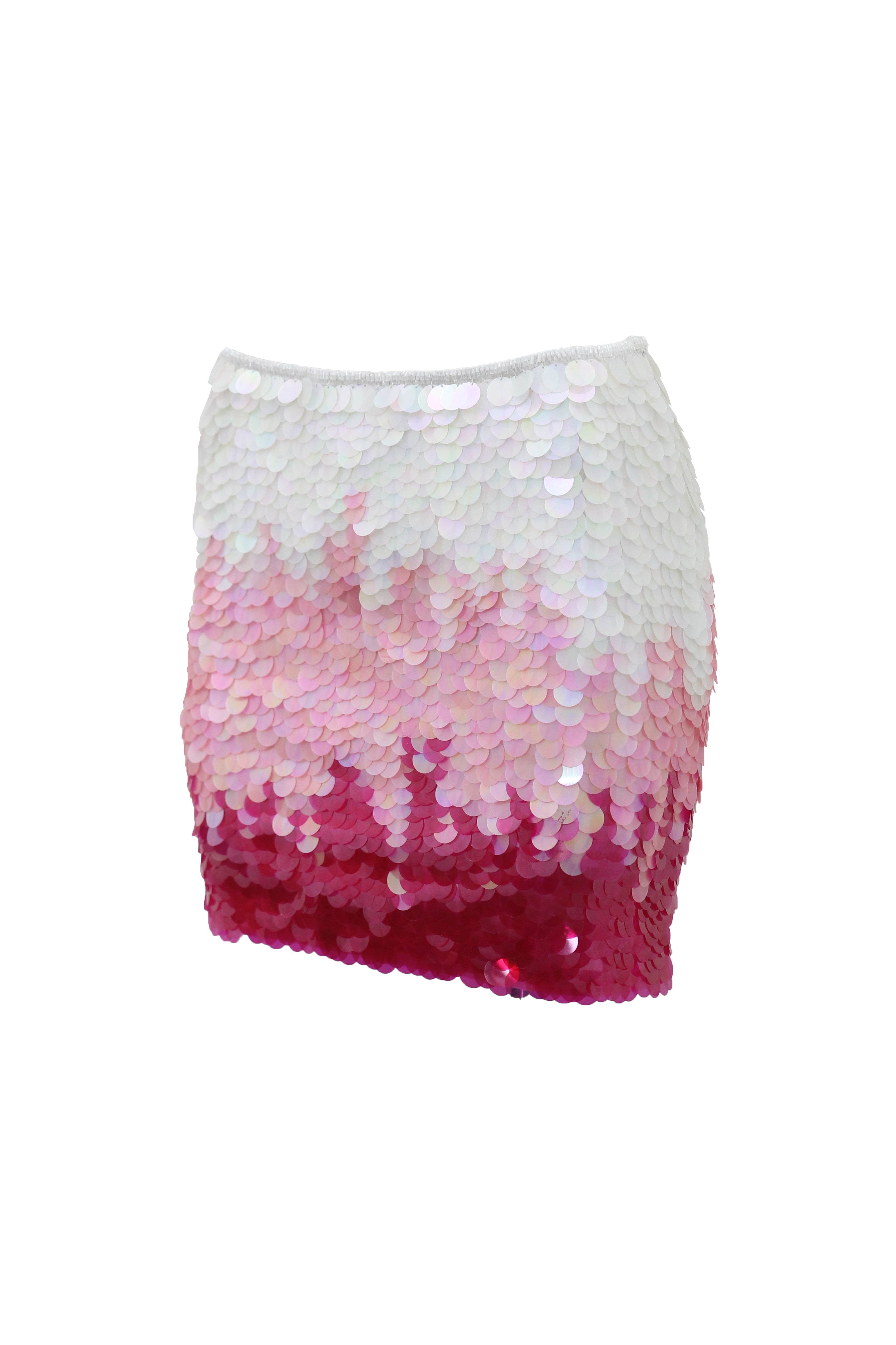 A playful mini skirt covered in large sequins that transition from white at the waist to a bold fuchsia at the hem.