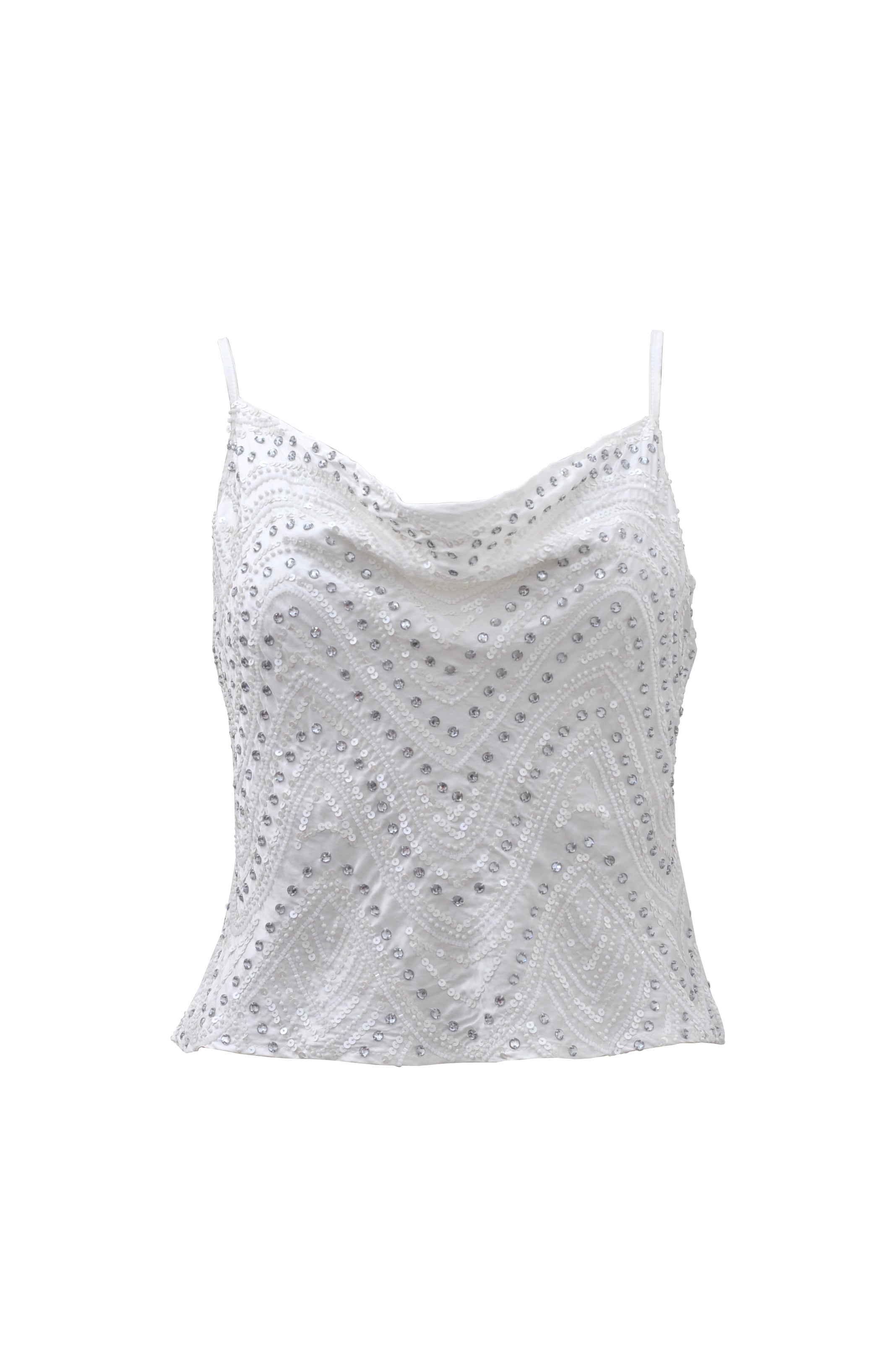 A stylish cowl-neck top in white, featuring an entirely hand beaded sequin chevron pattern for a elegant shimmer.